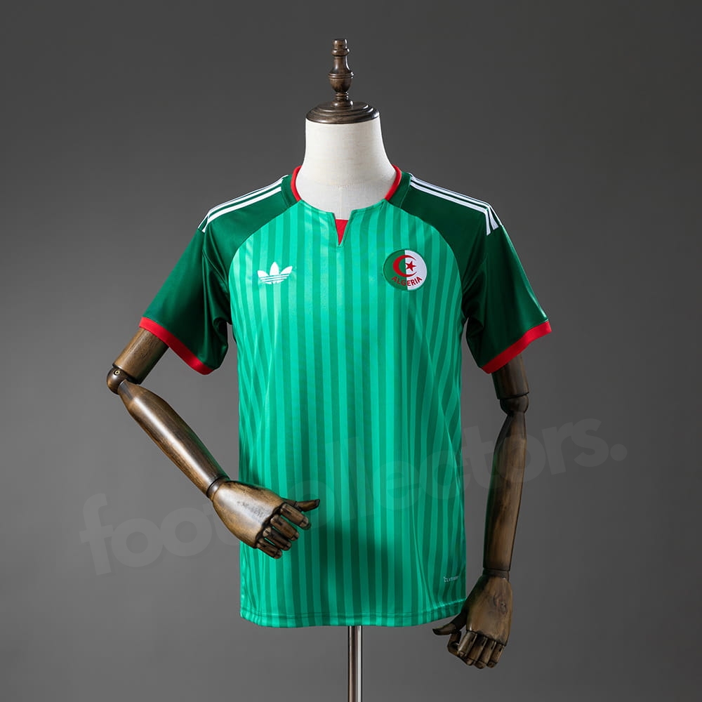 Le maillot Algerie Exterieur 2026 2027 incarne l’élégance, la fierté et l’identité des Fennecs à l’occasion de la Coupe du Monde 2026. Présenté dans un vert intense et lumineux, il se distingue par de fines rayures verticales ton sur ton qui apportent relief et modernité. Les touches de rouge au col et aux manches rappellent subtilement les couleurs nationales, affirmant l’attachement de l’Algérie à son héritage tout en adoptant un style contemporain pour la Coupe du Monde 2026.