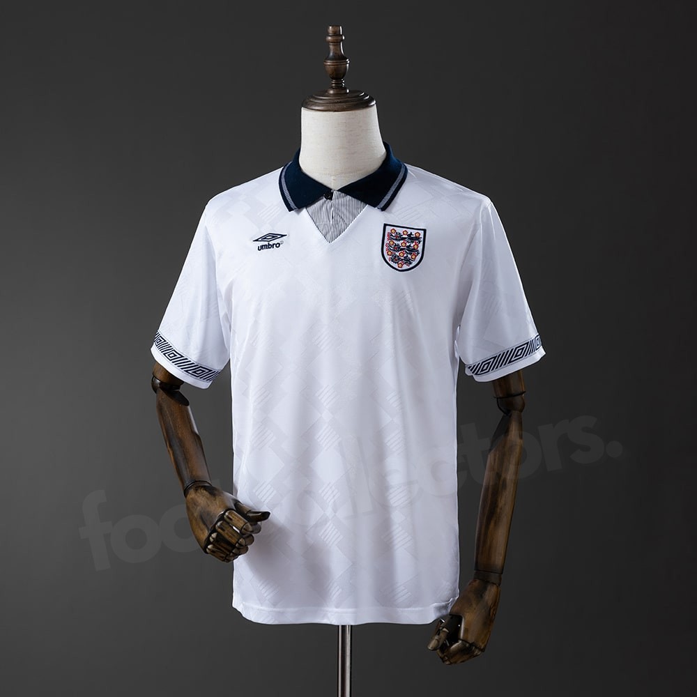 Le maillot retro vintage domicile de l’Angleterre pour l’année 1990 est l’un des modèles les plus mythiques jamais conçus par Umbro. Porté lors de la Coupe du Monde 1990 en Italie, ce maillot incarne à la perfection le style emblématique du début des années 90, avec ses motifs géométriques subtils et son élégance intemporelle. Il demeure aujourd’hui l’un des maillots les plus appréciés et reconnaissables des Three Lions.