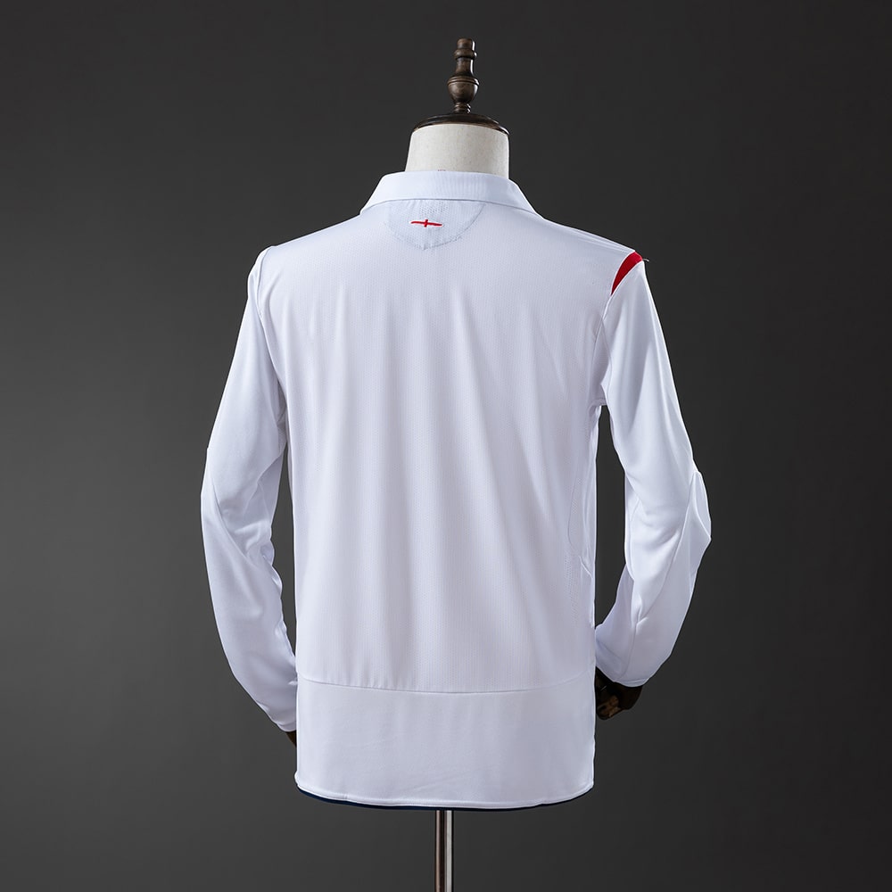 Le maillot retro vintage domicile de l’Angleterre pour l’année 2006 en version manches longues est l’un des modèles les plus marquants de l’ère Umbro. Porté durant la Coupe du Monde 2006 en Allemagne, il combine modernité, minimalisme et détails symboliques. Sa silhouette épurée, rehaussée par des touches rouges dynamiques, incarne parfaitement l’identité visuelle des Three Lions au milieu des années 2000.