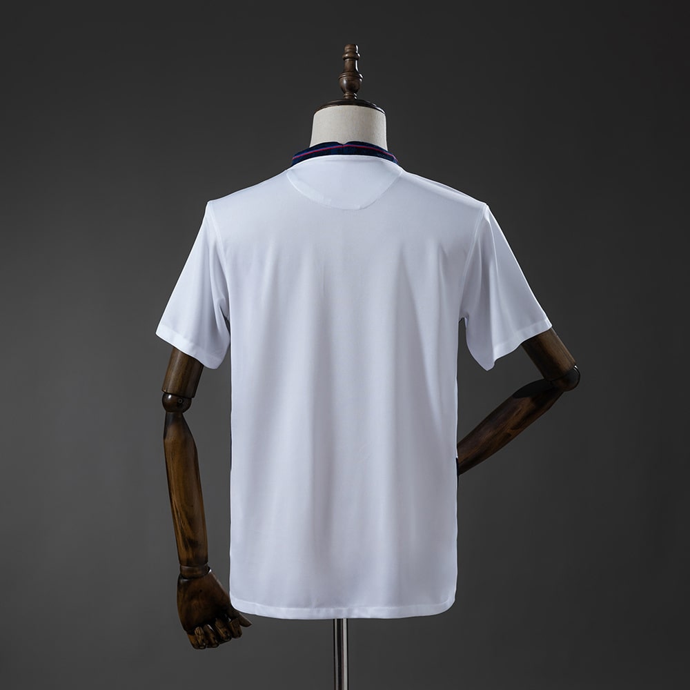 Le maillot retro vintage domicile de l’Angleterre pour la saison 2022 incarne l’élégance et la sobriété caractéristiques de la sélection anglaise. Fidèle à la tradition, ce maillot blanc épuré met en avant un design minimaliste, rehaussé de détails subtils bleu et rouge, symboles forts de l’identité des Three Lions. Il reflète parfaitement l’équilibre entre héritage historique et modernité.