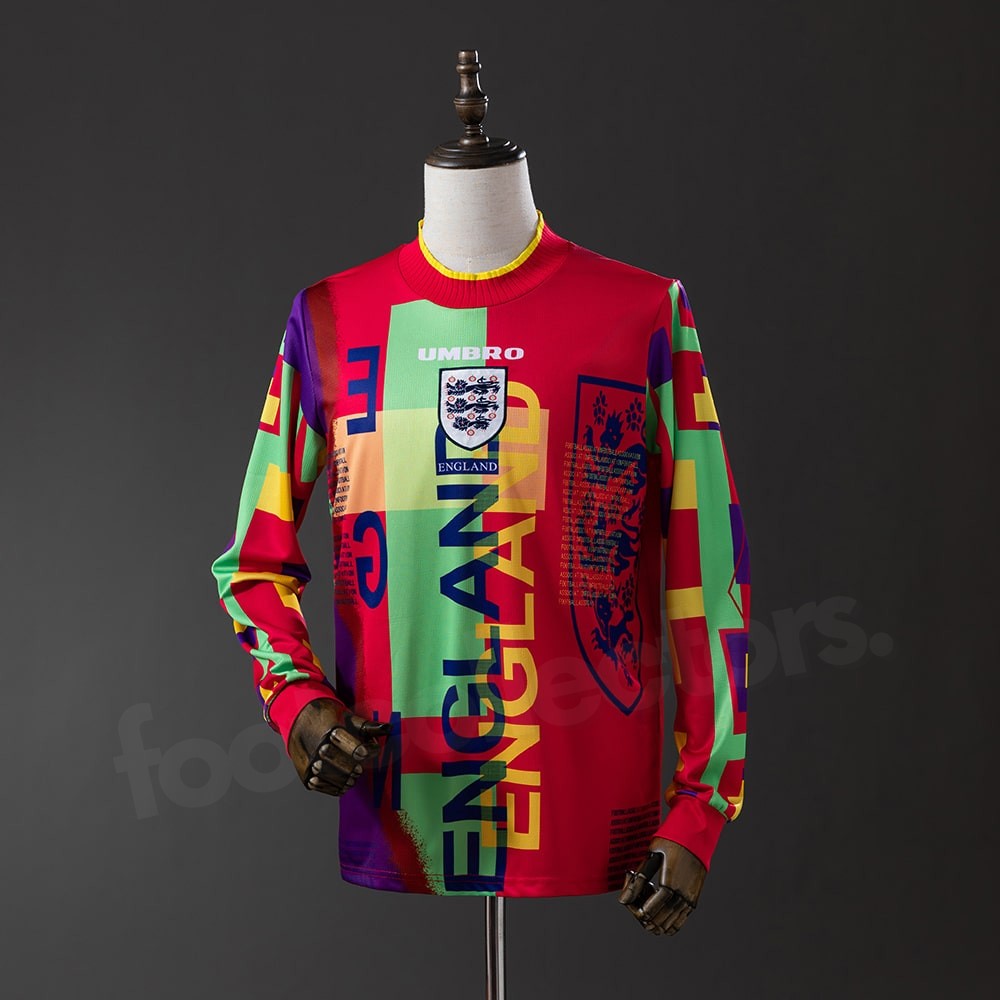 Le maillot retro vintage gardien de l’Angleterre pour l’année 1996 en version manches longues est l’un des modèles les plus audacieux jamais conçus par Umbro. Avec son mélange explosif de couleurs vives et son design patchwork, il incarne à la perfection la créativité extravagante des années 90. Unique, vibrant et totalement assumé, ce maillot est devenu une véritable pièce culte pour les collectionneurs.