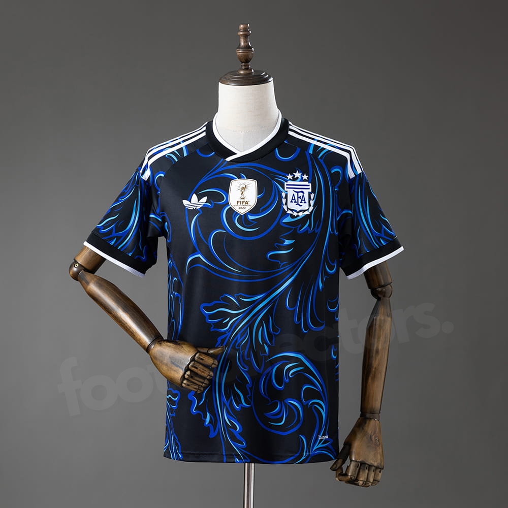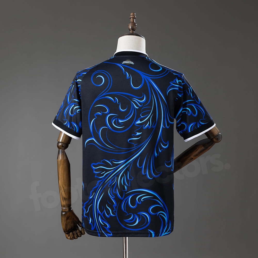 Le maillot Argentine exterieur pour la saison 2026 2027 se distingue par un design audacieux et moderne, parfaitement adapté à l’univers de la Coupe du Monde 2026. Ce modèle extérieur abandonne les couleurs traditionnelles pour proposer une base noire élégante sublimée par des motifs graphiques bleus dynamiques, inspirés du style artistique et de l’identité visuelle du football argentin.
