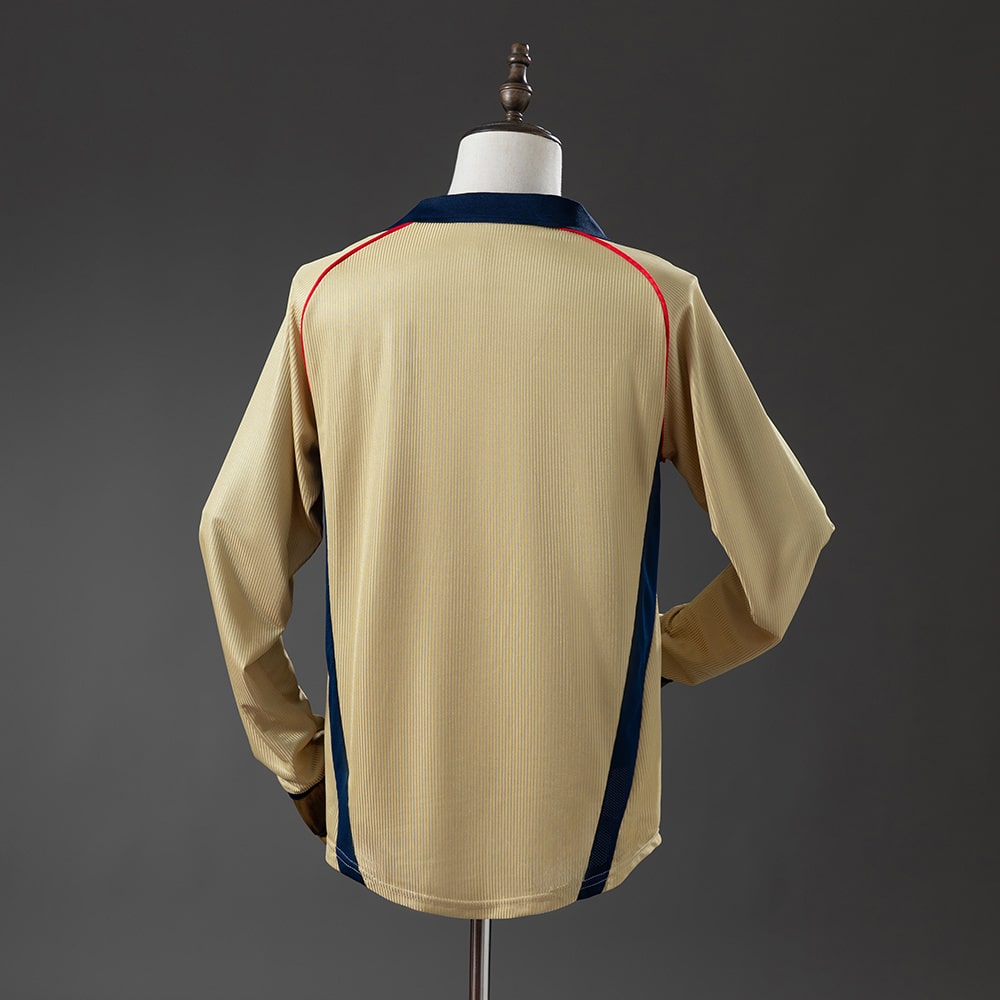 Le maillot retro vintage extérieur manches longues d’Arsenal pour la saison 2001-2002 est une version iconique du célèbre maillot doré, symbole du doublé historique réalisé par le club. Conçu par Nike, il associe élégance, confort et prestance, avec son tissu doré raffiné et ses détails contrastés bleu marine et rouge. Ce maillot incarne la grandeur des Gunners sous l’ère Arsène Wenger.
