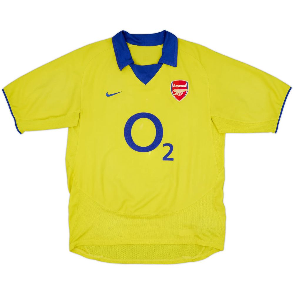 Le maillot retro vintage extérieur d’Arsenal pour la période 2003-2005 est l’un des modèles les plus emblématiques de l’ère O2, marqué par son jaune vif et son col bleu royal. Porté par Dennis Bergkamp durant les saisons qui suivent l’exploit historique des Invincibles, ce maillot représente une période où Arsenal alliait élégance, maîtrise technique et grande stabilité sportive sous la direction d’Arsène Wenger.