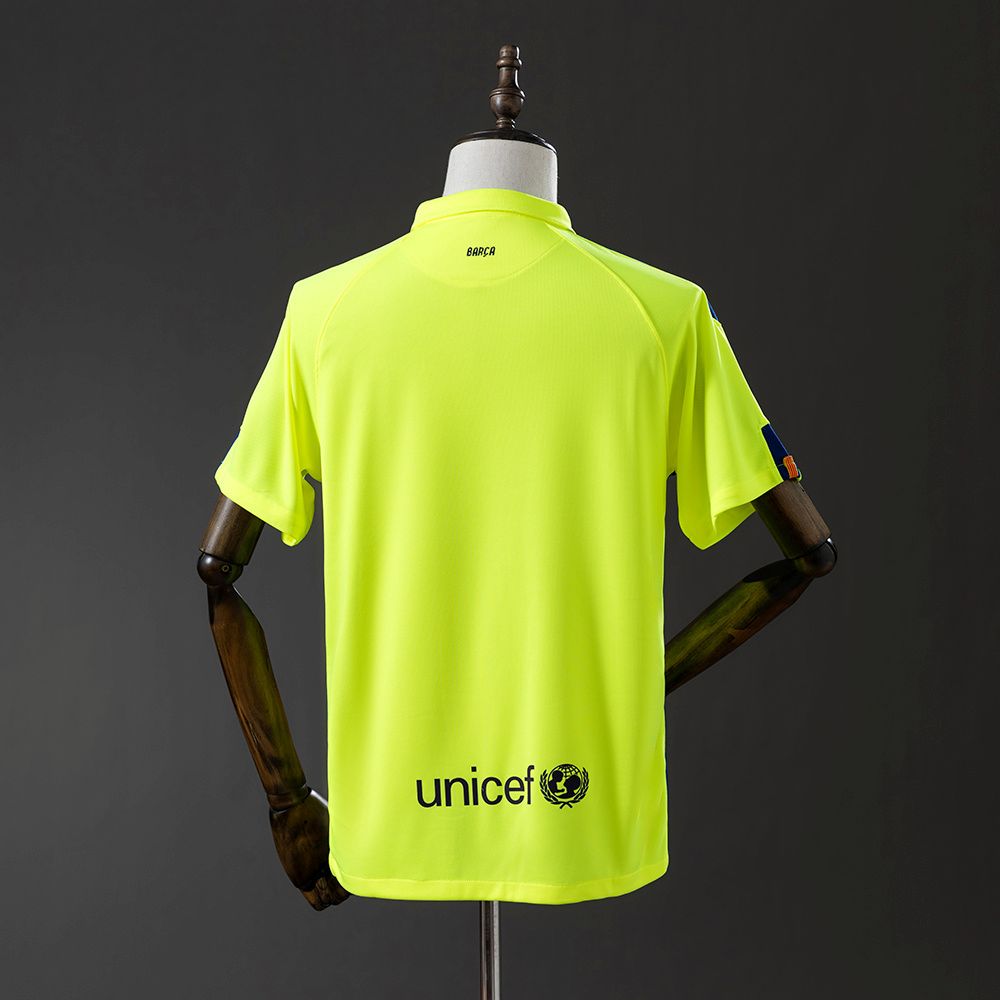 Le maillot retro vintage third du FC Barcelone pour la saison 2014-2015 est une pièce audacieuse et moderne, pensée pour offrir une visibilité maximale sur le terrain tout en conservant l’identité prestigieuse du club catalan. Avec sa couleur fluorescente éclatante et ses touches de bleu, cette tunique attire immédiatement l’œil et incarne parfaitement l’ère Neymar–Messi–Suárez qui a marqué l’histoire du Barça.