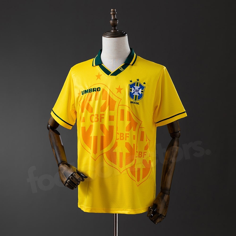 Ce maillot reste à jamais associé à la gloire du Mondial 1994, remporté par le Brésil après une finale historique face à l’Italie. Porté par des légendes comme Romário, Bebeto, Dunga, Rai et Taffarel, il marque le retour du Brésil sur le toit du monde après 24 ans d’attente. Ce design Umbro est devenu un symbole de la passion et du jeu offensif brésilien.