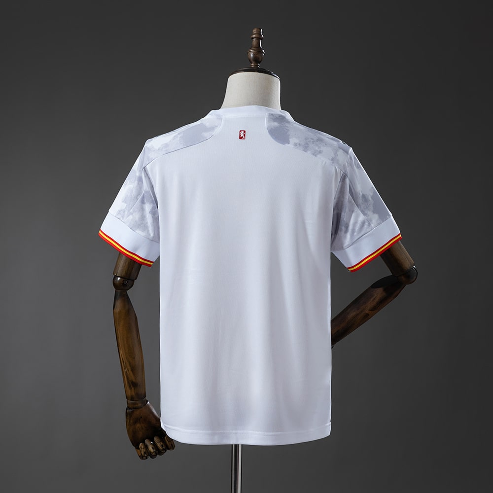 Ce maillot extérieur se démarque par sa teinte gris clair subtilement nuancée, offrant un rendu sobre et contemporain. Le motif texturé apporte de la profondeur au tissu et renforce son caractère unique. Les finitions aux couleurs rouge et jaune sur les manches rappellent le drapeau espagnol et soulignent l’attachement à l’identité nationale. Le col en V apporte une touche dynamique et élégante, parfaitement adaptée à l’esthétique moderne du maillot.