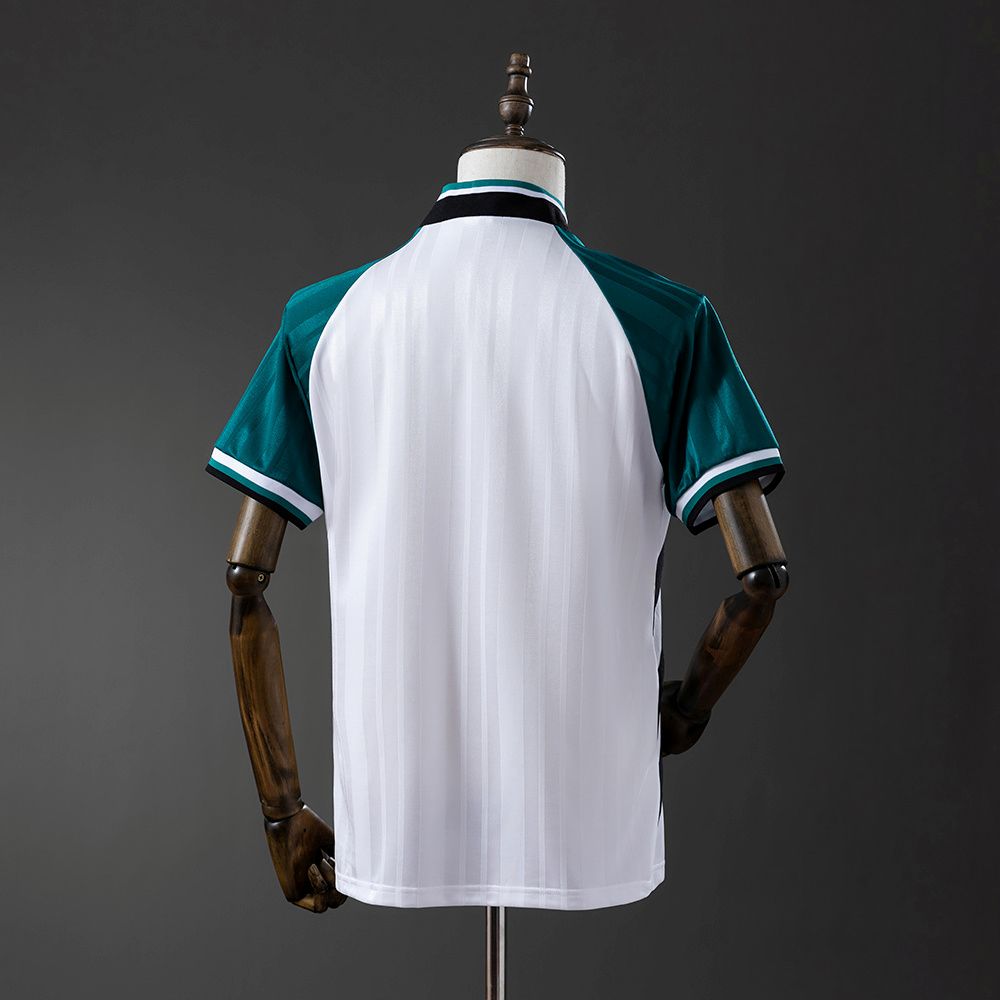 Le maillot retro vintage extérieur de Liverpool 1993-1995 est l’un des modèles les plus marquants de la période Adidas Equipment. Avec son design audacieux, ses teintes contrastées et ses motifs géométriques typiques du début des années 90, il fait partie des maillots rétro les plus recherchés par les collectionneurs. Ce modèle illustre parfaitement l’identité visuelle avant-gardiste de Liverpool durant cette période.