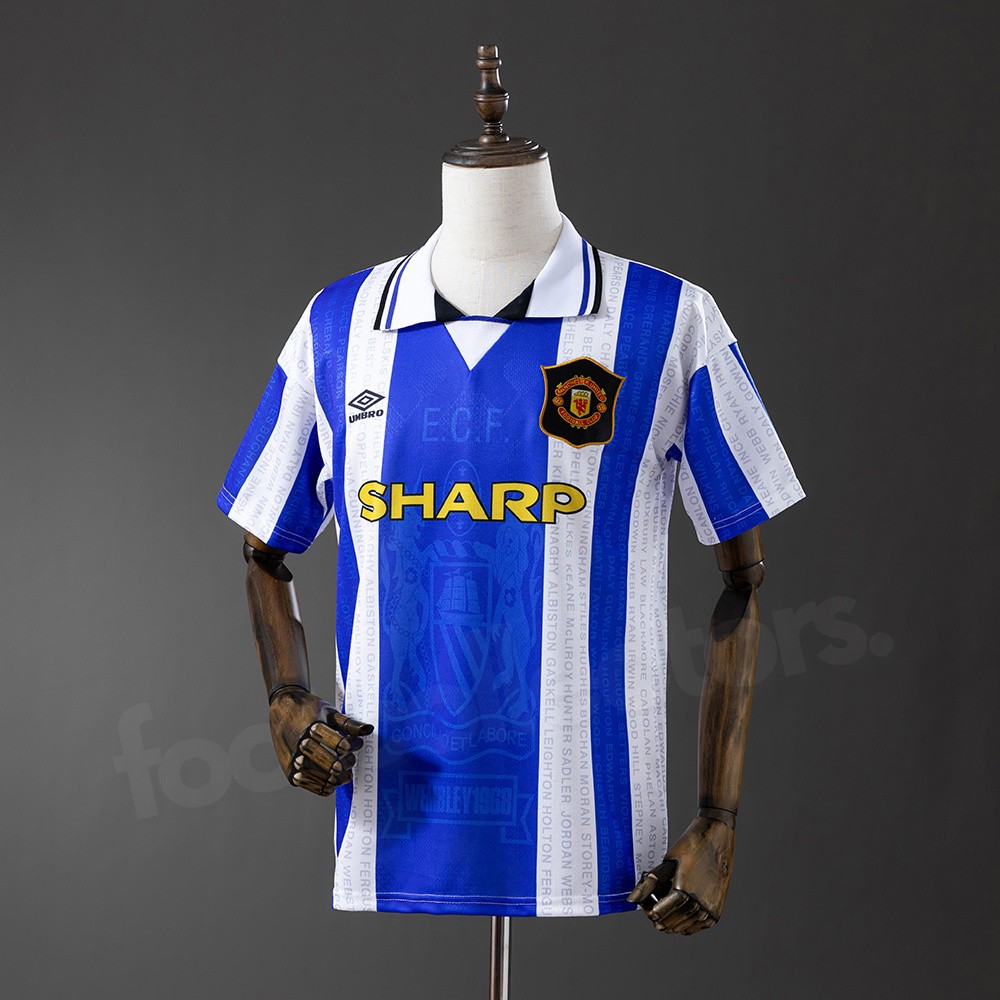 Le maillot se distingue par ses bandes verticales bleu royal et blanches, intégrant des motifs texturés et des inscriptions ton sur ton qui rendent hommage à l’histoire du club. Le col noir et blanc lui donne une allure élégante tandis que le sponsor SHARP, imprimé en jaune, ajoute un contraste puissant et immédiatement reconnaissable. Le blason spécial, utilisé uniquement sur certains modèles de la période, renforce son caractère collector.