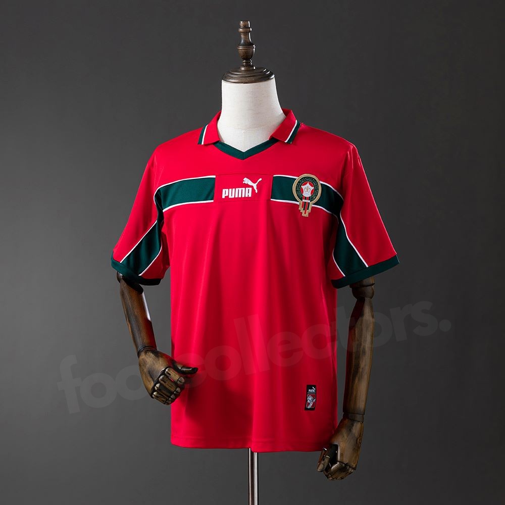 Le maillot retro vintage extérieur du Maroc pour l’année 1998 est l’un des modèles les plus emblématiques de l’ère Puma. Porté lors de la Coupe du Monde en France, il arbore un rouge vif soutenu par des touches vert foncé, reprenant fièrement les couleurs du drapeau marocain. Son design simple, équilibré et typiquement 90’s en fait aujourd’hui une pièce très recherchée par les passionnés de maillots vintage.