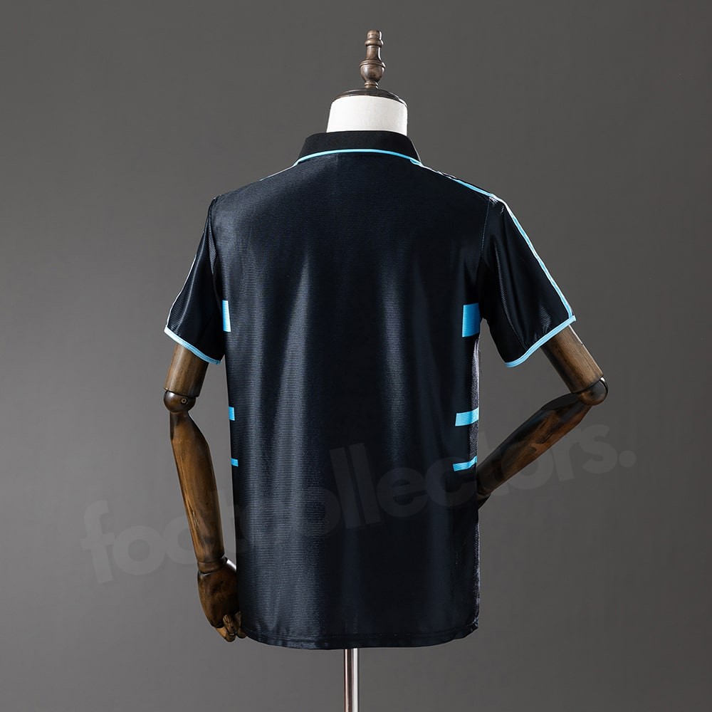 Version alternative et audacieuse, le maillot retro vintage fourth de l’Olympique de Marseille pour la saison 1998-1999 est un modèle marquant du partenariat entre Adidas et le club phocéen. Cette tenue noire et bleue incarne l’esprit moderne et urbain du football de la fin des années 90, tout en restant fidèle à l’identité visuelle du club.