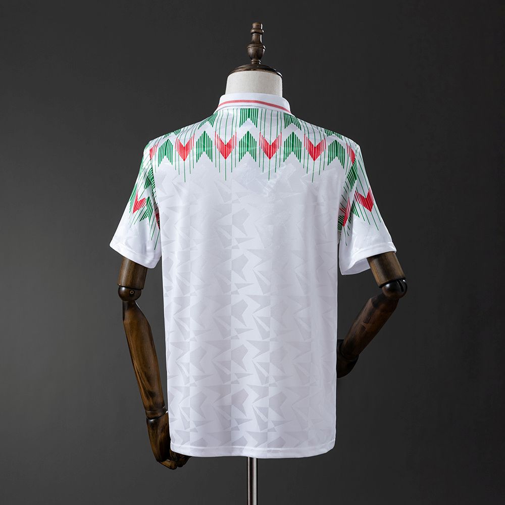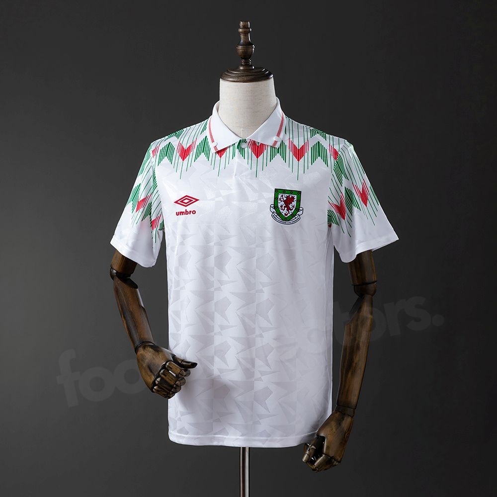 Ce maillot retro vintage extérieur du Pays de Galles 1990-1992 est une pièce culte pour les amateurs de vintage. Conçu par Umbro, il se distingue par son design audacieux typique des années 90, mêlant motifs géométriques ton sur ton et un col polo blanc orné de touches rouges. L’emblématique motif vert et rouge sur les épaules apporte une identité forte et immédiatement reconnaissable, rendant ce maillot aussi unique qu’iconique.