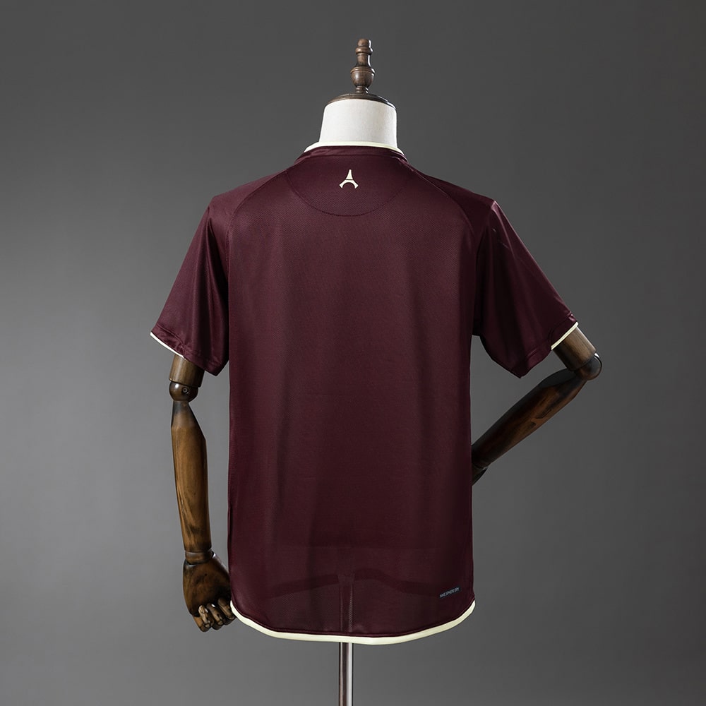 La saison 2006-2007 est une période contrastée pour le PSG, marquée par une lutte intense en championnat et une identité en pleine reconstruction. Ce maillot extérieur accompagne le club lors de déplacements importants et symbolise une phase de modernisation visuelle. Son coloris bordeaux, rare dans l’histoire du PSG, en fait aujourd’hui une pièce recherchée par les supporters et collectionneurs, séduits par son originalité et son esthétique singulière.