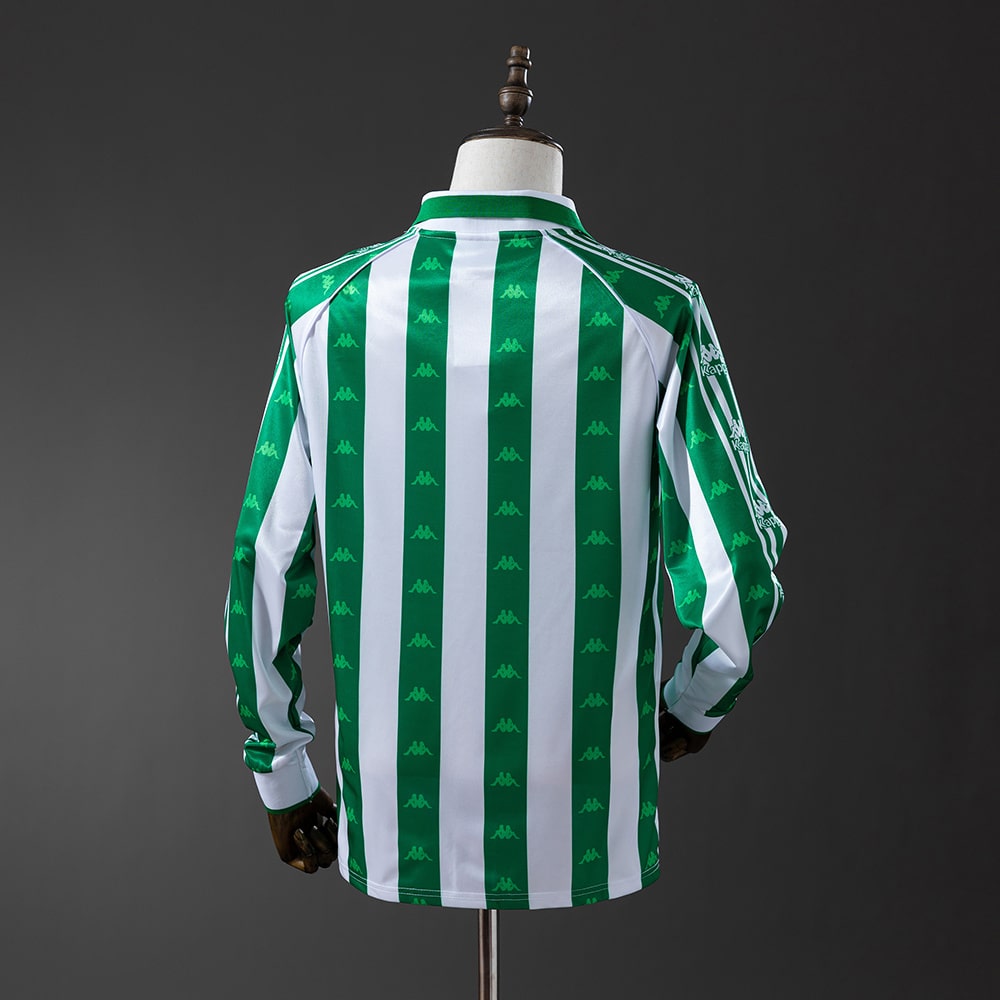 Le maillot retro vintage domicile du Real Betis pour la période 1995-1997 en version manches longues est une pièce emblématique signée Kappa. Reprenant les bandes verticales vertes et blanches traditionnelles du club, ce modèle allie élégance, confort et caractère. Il illustre à la perfection l’esprit du Betis et la créativité de Kappa dans les années 90, une époque où le design sportif mêlait identité et audace.